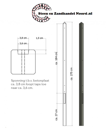 Lichtgewicht betonpaal met diamantkop ongecoat 8,5x8,5x275 cm, eindpaal, antraciet.