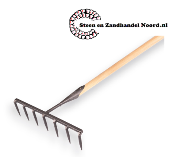 Zaadhark gesmeed met 7 ronde tanden, compleet met stevige gewaxte steel 160x3,2cm. Ideaal voor het maken van een zaaibed. Merk Atlas, De Wit