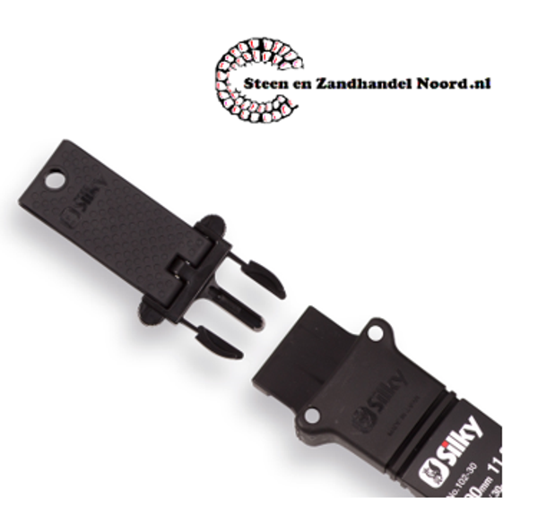 Silky vaste snoeizaag Tsurugi 300 - 8 incl. veilig holster, voor dichte begroeiing. (SILKY artikelnummer KSI345030) Bladlengte: 300 mm (tot ¯ 150 mm) Vertanding: grof (8 tanden per 30 mm) Het smalle rechte blad met lage rug van de Tsurugi snoeizaag is verchroomd en voorzien van Silky's unieke Mirai-Me vertanding. Deze laser uitgesneden tanden, met een kerf van 1.6 mm., zagen snel en door de vorm van het smalle zaagblad gemakkelijk tussen takken door. De rubberen handgreep ligt comfortabel en vast in de hand en absorbeert trillingen. De Tsurugi snoeizaag is voorzien van een lichtgewicht, aluminium holster met afneembare riemhouder. Het holster is zo ontworpen dat de zaag er in geen mogelijkheid uit valt. Maar de zaag trekt u tegelijkertijd in ŽŽn beweging uit het holster. De twee rolletjes in het holster voorkomen dat de scherpe tanden de hoes beschadigen en onderkant is voorzien van een grote opening voor het verwijderen van vocht en zaagsel. Het zaagblad maakt u het beste schoon met olijfolie. Hars lost op in olijfolie en dit is dan ook een effectieve en milieuvriendelijke manier om het blad te reinigen en de zaagcapaciteit te behouden. Schuif de meegeleverde hoes over het gereinigde zaagblad en bewaar de zaag op een droge plaats. De naam Tsurugi is vernoemd naar een tweesnijdend Japans zwaard dat werd gebruikt in de oudheid. Silky wordt geproduceerd in Japan sinds 1919 uit hoogwaardig SK-4 Carbonmetaal.