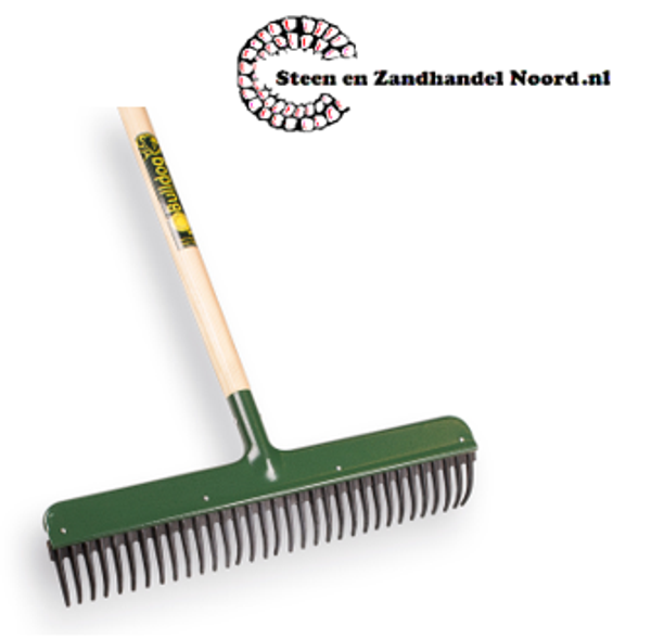 Bladhark BULLDOG met 33 rubber tanden, werkbreedte 52 cm, compleet met een gelakte Essen steel 135 x 3,0 cm. Deze hark is handig voor het harken van gravel op tennisbanen en voor licht (tuin)afval op een vlakke ondergrond.