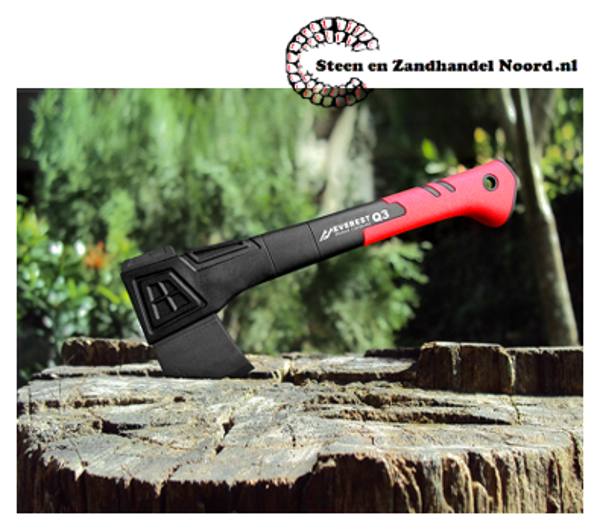 Handbijl EVEREST Q3, met een gewicht van 680 gram, voorzien van een sterke fiberglassteel in lengte 36 cm. Deze EVEREST bijl is TÜV GS-gecertificeerd, geschikt voor professioneel gebruik en wordt geleverd inclusief beschermhoes.