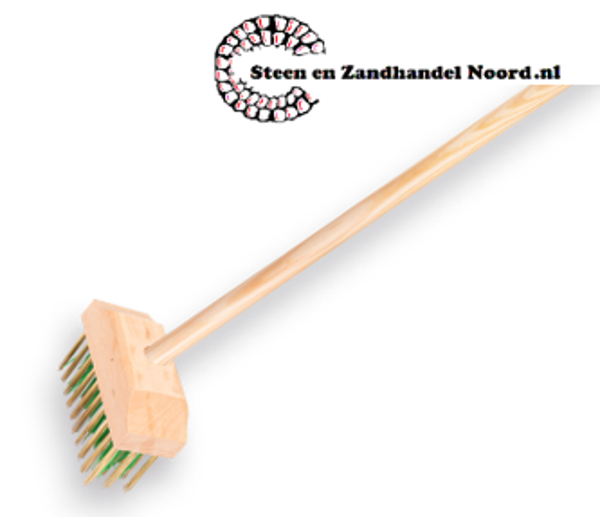 Onkruidborstel, afmeting 14x6cm, met 3 rijen gehard staaldraad en 2 rijen PPN vervaardigd in een stevig houten verdikte kap. Voorzien van een dikkere steel, 150x2,8 cm. Geschikt voor het schoonborstelen van vlonders en ruwe betonklinkers.