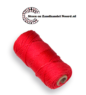 Nylon metselkoord kleur rood. Draaddikte 1,4 mm. Metselkoord is in tegenstelling tot uitzetkoord gedraaid/geslagen. Ook verkrijbaar in de kleur Wit. 50 meter op rol.