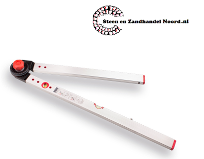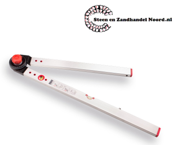 Hoekmeter met een aluminium kort been van 60 cm. en een aluminium lang been van 80 cm. is voorzien van een horizontale en verticale libel. De hoek van de benen is op twee manieren te fixeren. In graden of door de rode tussenschijf om te draaien in elke gewenste stand. Traploos instelbaar of in stappen van 15 graden met een meetbereik van 0 - 270 graden en is zeer geschikt voor het aanleggen van bestratingen. Merk BMI, made in Germany.