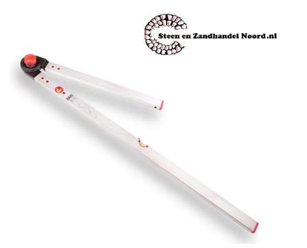 Hoekmeter met een aluminium kort been van 60 cm. en een aluminium lang been van 120 cm. is voorzien van een horizontale en verticale libel. De hoek van de benen is op twee manieren te fixeren. In graden of door de rode tussenschijf om te draaien in elke gewenste stand. Traploos instelbaar of in stappen van 15 graden met een meetbereik van 0 - 270 graden en is zeer geschikt voor het aanleggen van bestratingen. Merk BMI, made in Germany.